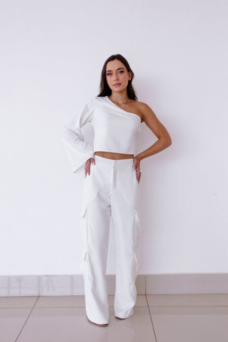 R$439,00Calça cargo confeccionada em linho rústico off white com modelagem reta. Possui bolsos nas laterais e bolso embutido na parte de trás.