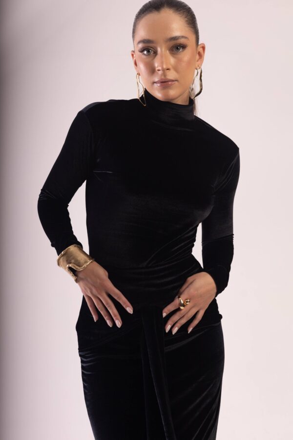 R$310,00Body confeccionado em veludo com elastano. Body apresenta decote assimétrico nas costas e fechamento com botão de pressão.