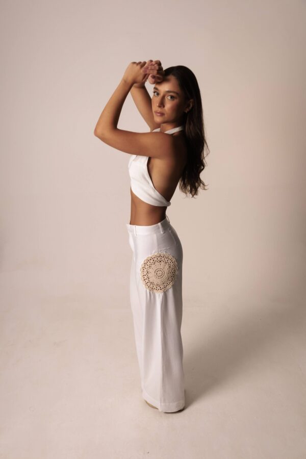 Importante: Esta calça é confeccionada sob medida e por encomenda, com um trabalho extremamente manual e cuidadoso. O prazo de confecção é de até 30 dias úteis, além do tempo de entrega dos Correios. Por ser uma peça exclusiva, não aceitamos trocas ou devoluções. Ao finalizar a compra, por favor, inclua na observação suas medidas (busto, cintura e quadril) e indique se prefere a calça cintura alta ou baixa.
